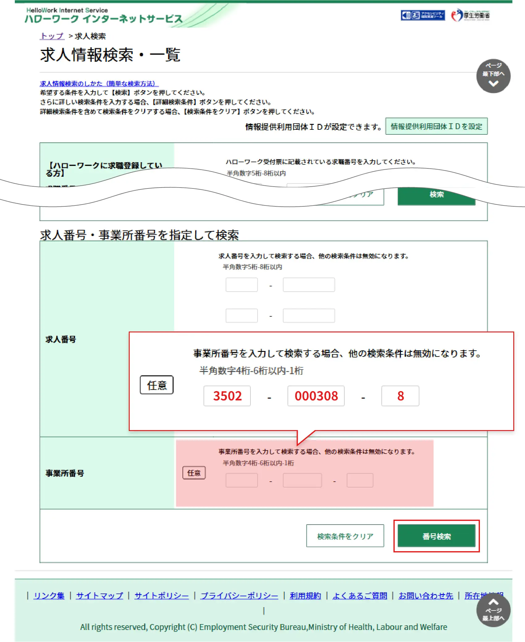 求人情報検索ページの下部にある「事業所番号」に以下番号を入力して、詳細をご確認ください。